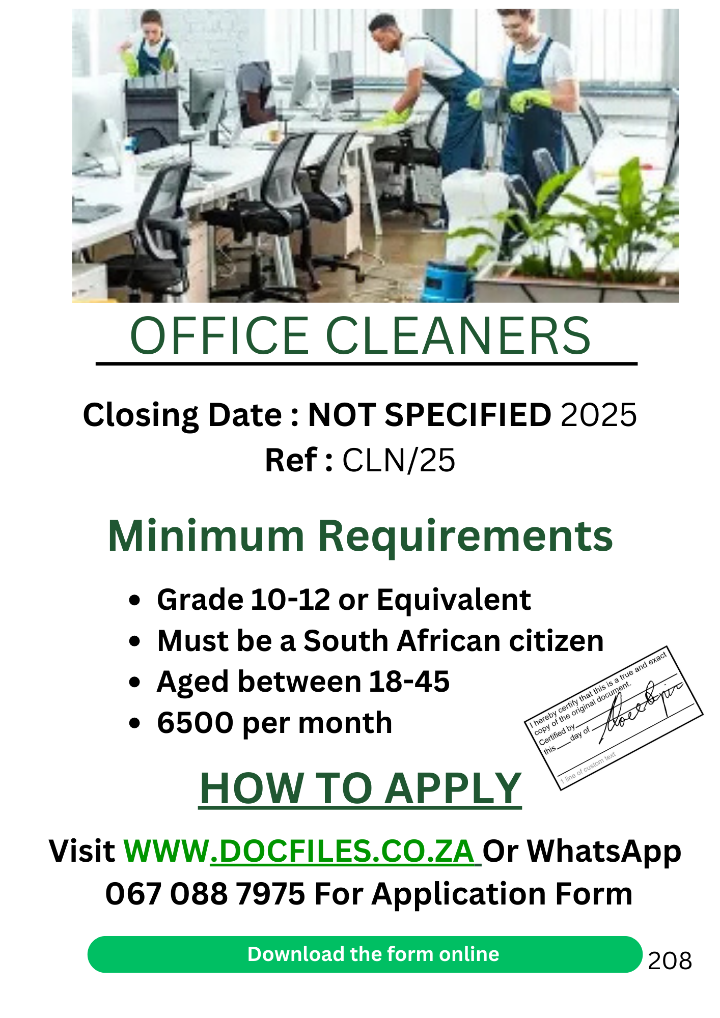 Closing Date: 22 October 2025 Job Description Main purpose of the position: You will help keep our workplace spotless, well-stocked, and welcoming by cleaning, restocking, and taking part in special cleaning projects. Education and Experience required: Matric is essential. If