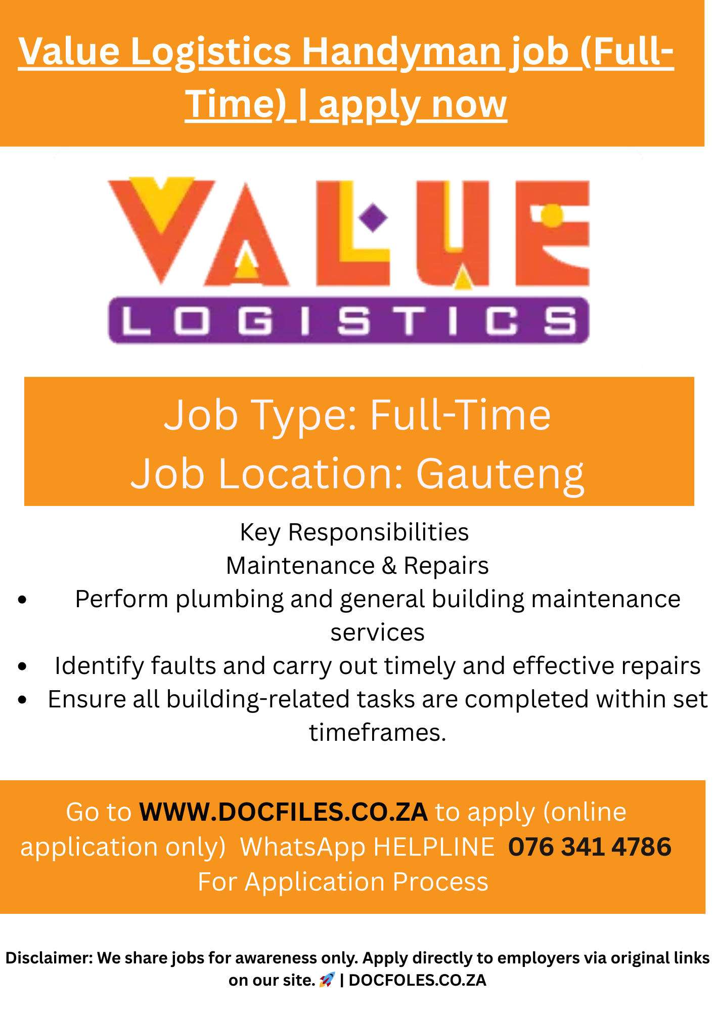 Are you a skilled handyman ready to make an impact? Join Value Logistics in Gauteng to maintain our facilities, lead improvements, and ensure safety standards every day. Apply today to be a valued part of our team! About the Value