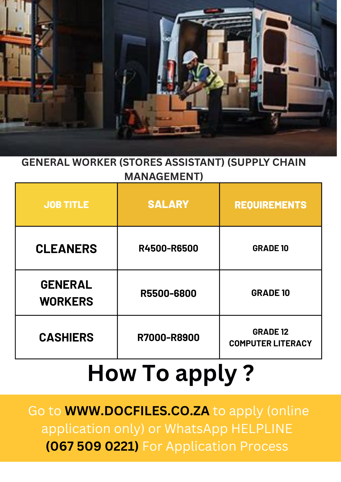 Garden Route District SALARY: R138 486 per annum CENTRE: Oudtshoorn Hospital REQUIREMENTS: Minimum requirement: Basic numeracy and literacy skills. Experience: Appropriate experience in a warehouse environment. Appropriate experience in receiving and distributing stock. Inherent requirement of the job: Willing to