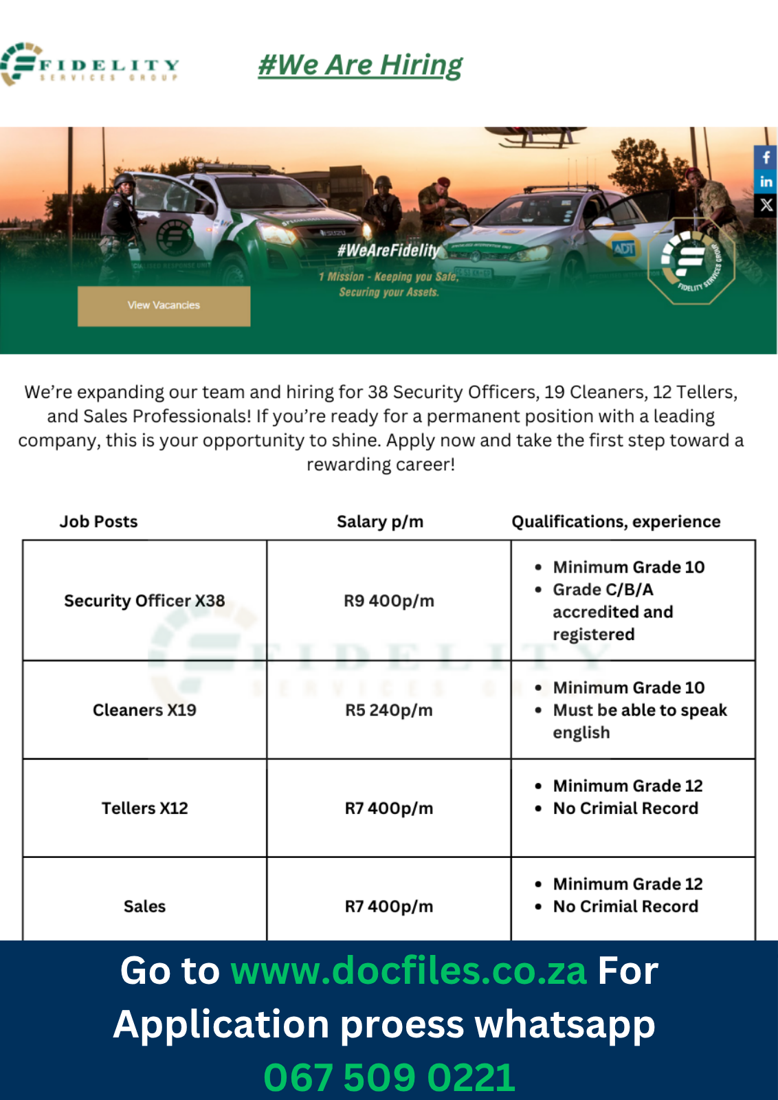 Directorate: Human Resource Administration SALARY: R228 321 per annum (plus competitive benefits) CENTRE: Pretoria REQUIREMENTS: A Senior Certificate (Grade 12) or equivalent NQF 4 qualifications. A records management certificate and experience in archiving will be an advantage. Knowledge of registry