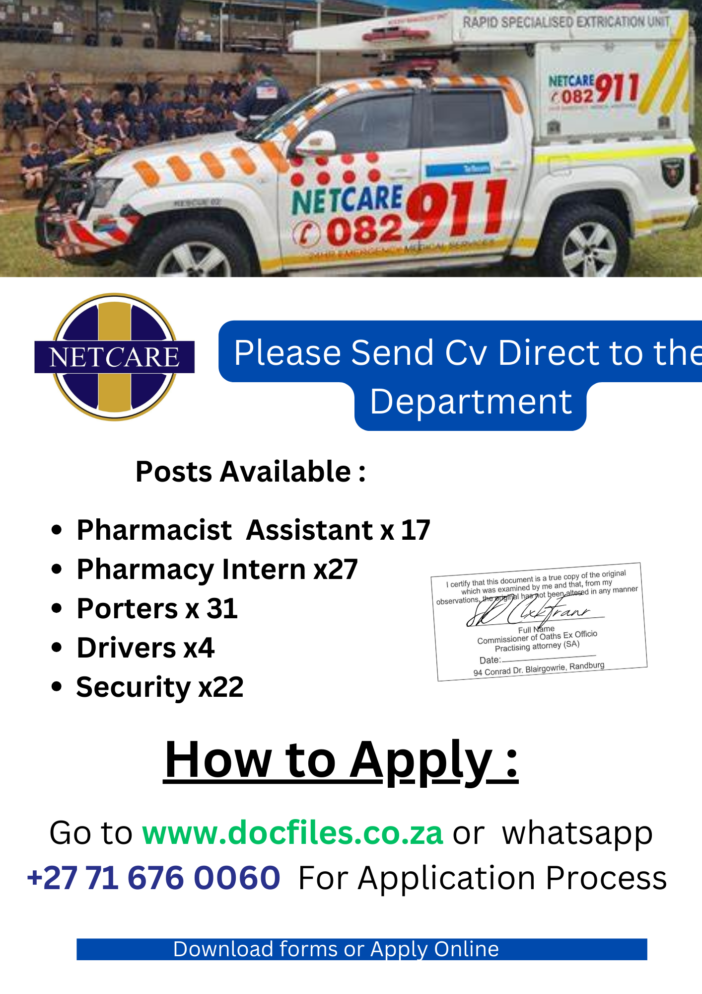Position: Porters Company: Netcare Pholoso Hospital Location: Polokwane, Limpopo Employment Type: Permanent Number of Positions: 10 Job Overview Netcare, a leading healthcare provider in South Africa, is looking for dedicated Porters to join its team in 2025. Porters play a vital role in hospital operations by