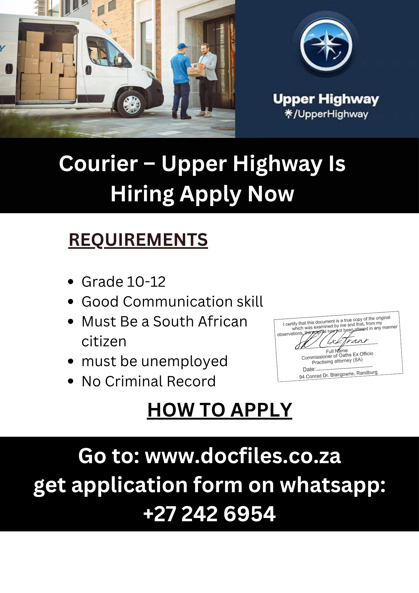 Advert Reference: P15953 Courier – Upper Highway Job Title: Courier – Upper Highway Closing Date: 2025/06/17 Position Available From: 2025-06-06 Area: Kassier Rd Actual Place Of Work: Kassier Rd Position Type: Full-Time Flexible Work Week Weekly Hours: 45 HOURS Time